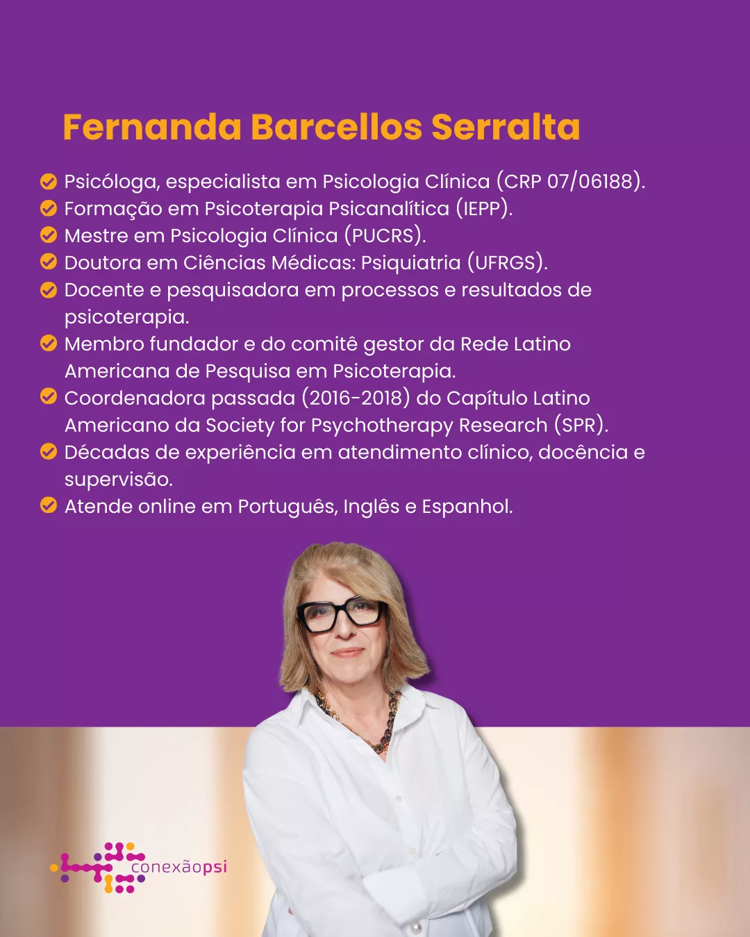 A Dra. Fernanda Serralta é psicóloga e psicoterapeuta psicodinâmica, com ampla experiência clínica, docente e de pesquisa. Possui expertise consolidada no campo da personalidade e da relação terapêutica, articulando prática clínica e produção científica .