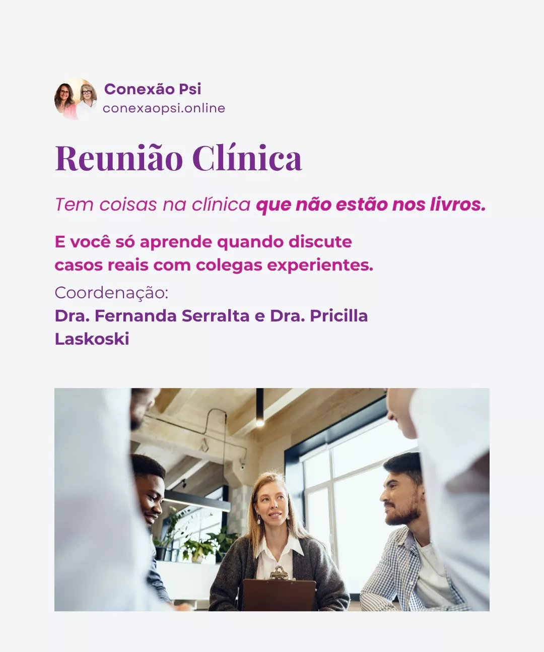 A Reunião Clínica é coordenada pelas Dras. Fernanda Serralta e Pricilla Laskoski, psicólogas e psicoterapeutas com longa trajetória na clínica, na docência e na supervisão de profissionais em formação.